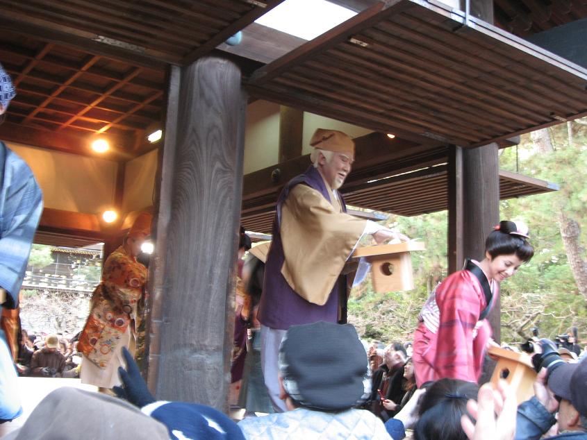 小雪がちらちら・・天神さんの節分祭 追儺式の狂言(茂山千五郎社中) 上七軒の舞踊につづき豆まきは黄門様ご一行でした。!!