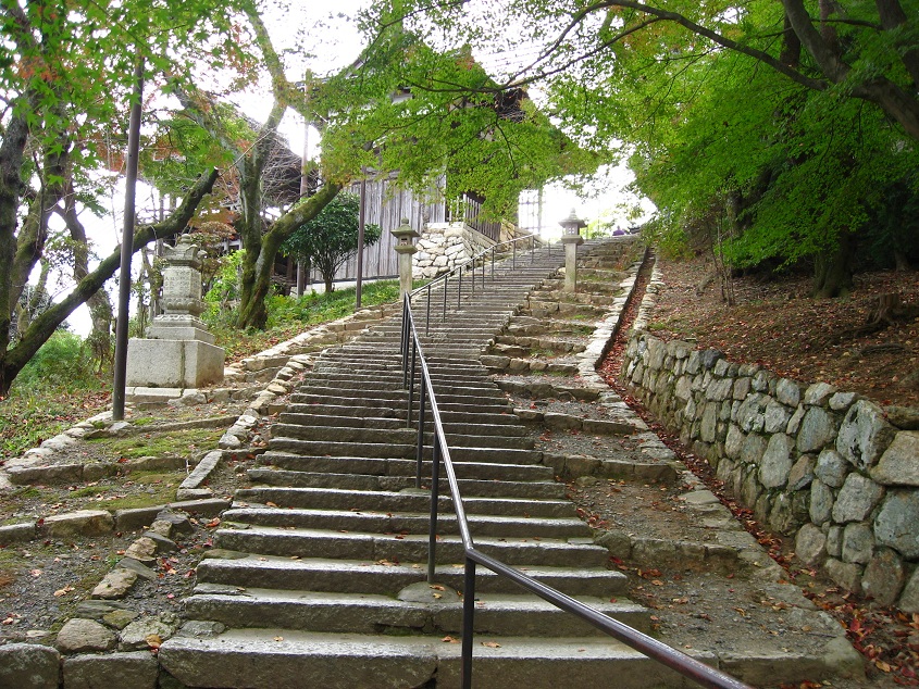 毘沙門堂の木々は紅葉して朱色のお堂と似合います。石段を登り西国十四番札所の観音堂へ