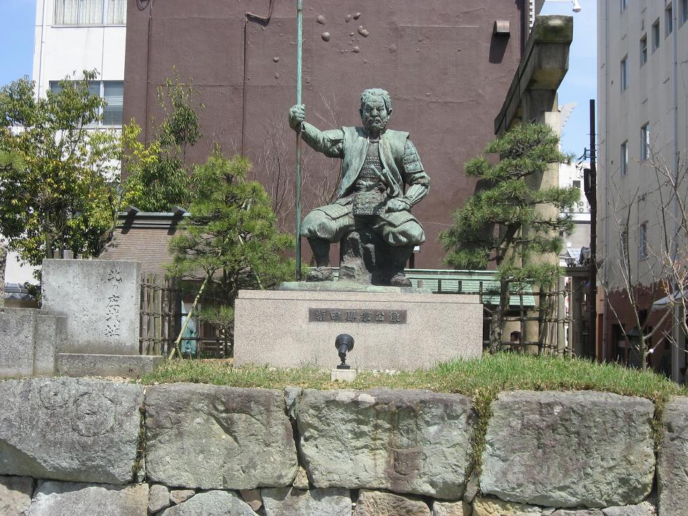 ビルの谷間に戦国武将の柴田勝家公の銅像
