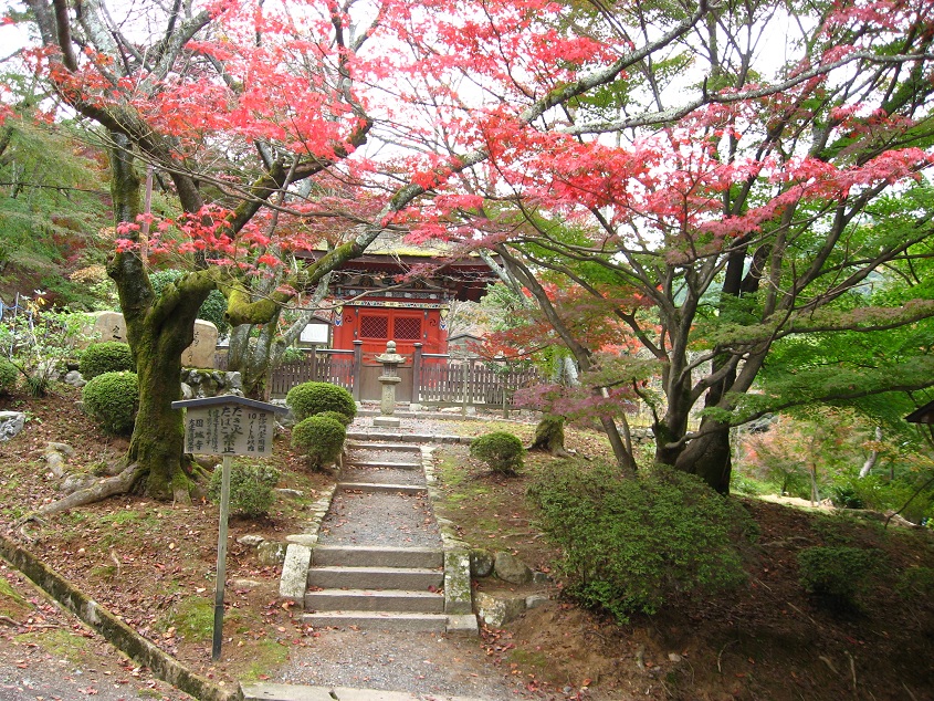 毘沙門堂の木々は紅葉して朱色のお堂と似合います。石段を登り西国十四番札所の観音堂へ